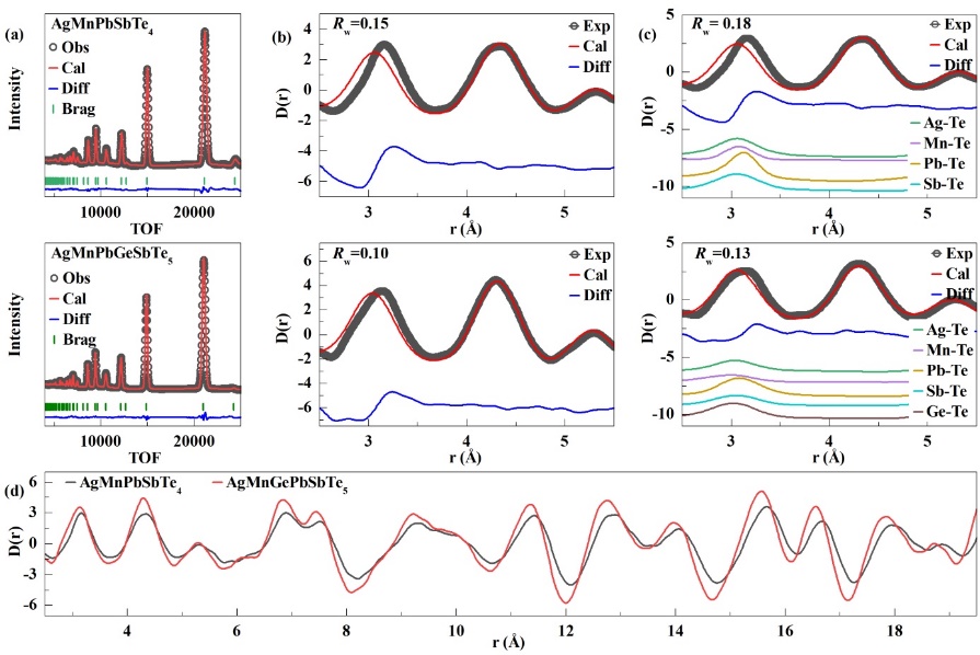 图: AgMnPbSbTe4与AgMnGePbSbTe5的中子衍射(NPD)及对分布函数(PDF)谱图的实验数据与理论拟合结果。
