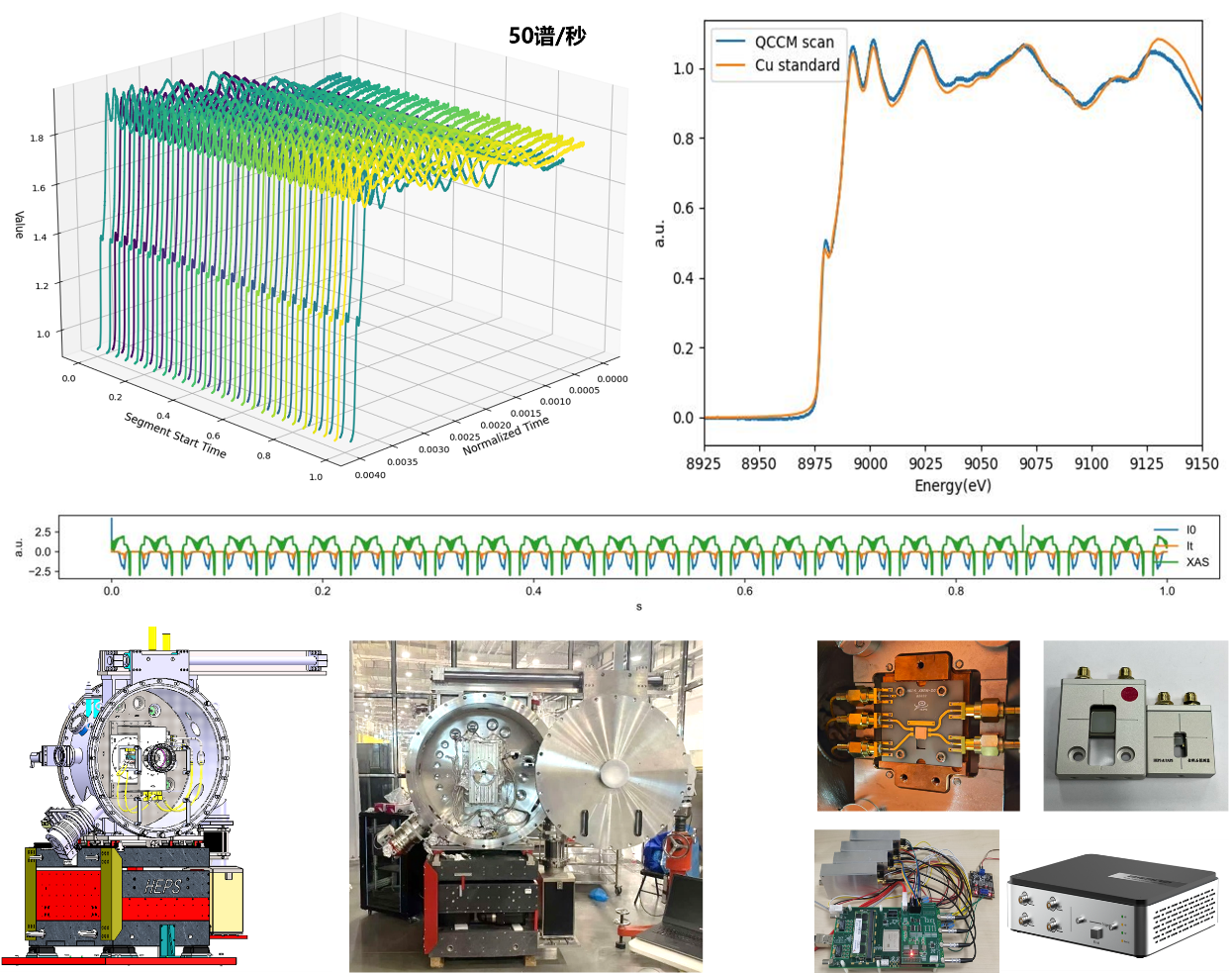 图:Cu箔XANES随时间的谱图展示及其与常规步进采集数据的对比。X射线吸收谱学线站:HEPS团队通过全套自研设备(快扫单色器及运动控制、金刚石探测器及采集电子学),实现了单谱20ms(50谱/秒)的XANES时间分辨能力。